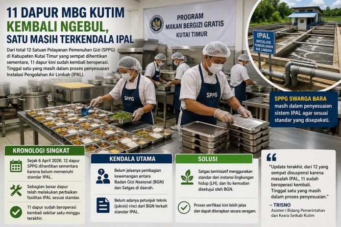 Asisten I Bidang Pemerintahan dan Kesra Setkab Kutim, Trisno, memastikan progresnya sudah signifikan. “Update terakhir, 11 dapur sudah beroperasi kembali. Tinggal satu yang masih proses penyesuaian,” ujarnya kepada awak media, Rabu (29/4/2026).