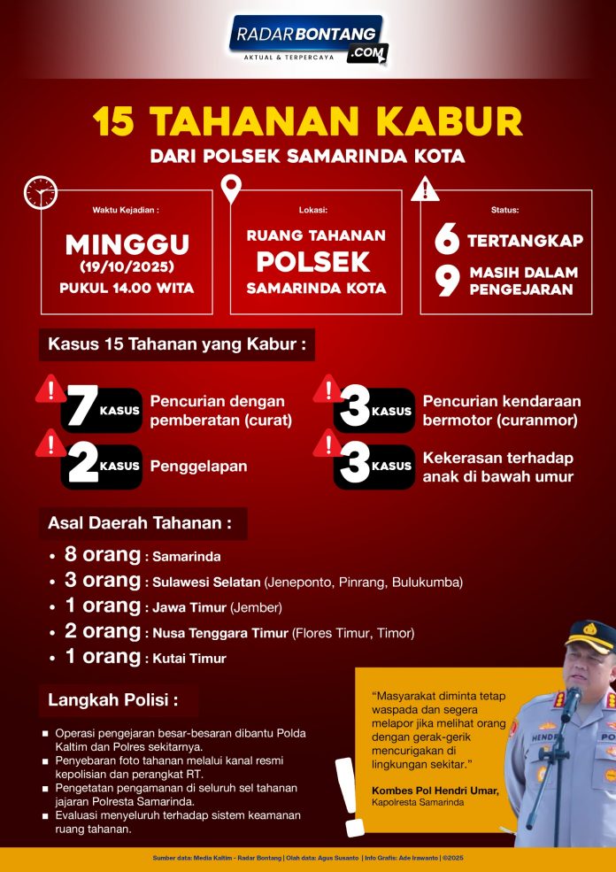 SORE itu, Minggu (19/10/2025), suasana di Mapolsek Samarinda Kota berubah panik. Petugas jaga yang melakukan pemeriksaan rutin sekitar pukul 14.00 Wita mendapati jumlah tahanan berkurang separuh. Dari 30 penghuni sel, hanya 15 orang yang tersisa. Di sudut belakang ruang tahanan, terlihat lubang berdiameter 35–40 sentimeter di balik kloset — menjadi saksi bagaimana 15 tahanan melarikan diri satu per satu melalui jalur yang tak lazim: dinding kamar mandi.