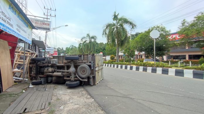 BONTANG – Sebuah truk box terbalik setelah bannya secara tiba-tiba kehabisan angin di depan sebuah toko alumunium di kawasan kilometer 6, Rabu (7/12/2025).