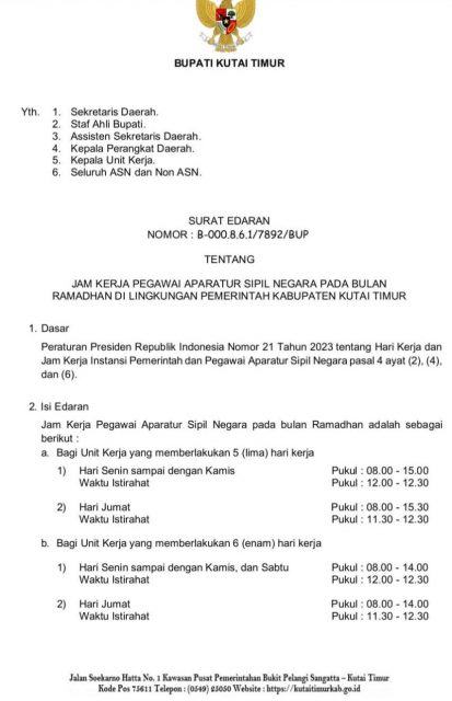 “Penyesuaian jam kerja ini ditetapkan agar pelayanan publik tetap berjalan optimal serta memberikan kesempatan bagi ASN menjalankan ibadah Ramadan dengan lebih khusyuk,” bunyi Surat Edaran Bupati Kutai Timur Nomor B-000.8.6.1/7892/BUP.