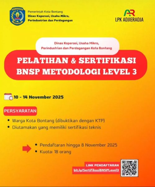 Bagi warga Bontang yang berminat langsung mendaftar sekarang juga. Dengan masuk ke link berikut: https://bit.ly/SertifikasiBNSPLevel3. Kuota hanya dibatasi 18 orang saja.