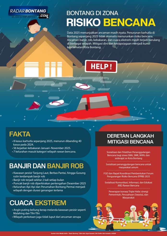 Kota Bontang, yang kerap dijuluki Kota Taman, justru termasuk wilayah dengan tingkat kerawanan bencana yang tinggi. Kepala Bidang Pencegahan dan Kesiapsiagaan BPBD Bontang, Eko Mashudi, menjelaskan bahwa terdapat empat jenis bencana utama yang berpotensi terjadi di Bontang, yakni banjir, tanah longsor, kebakaran hutan dan lahan (karhutla), serta cuaca ekstrem berupa angin kencang dan gelombang laut tinggi.