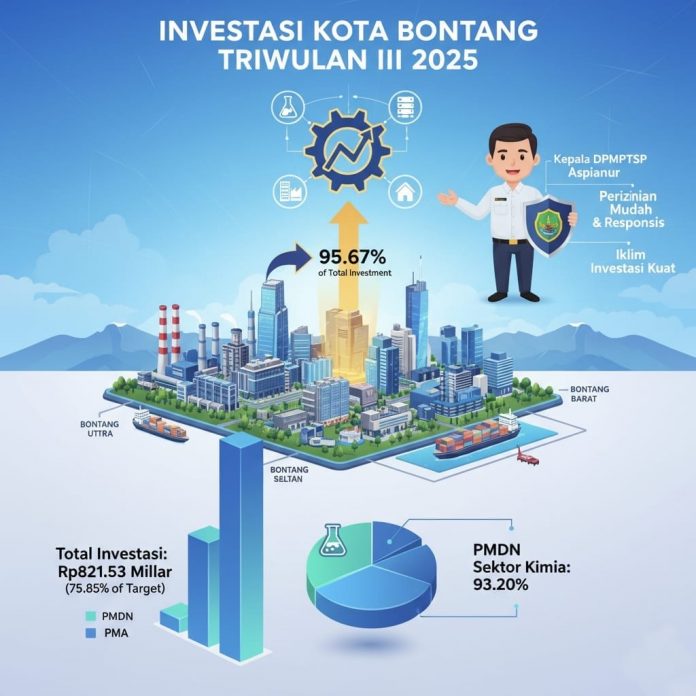 BONTANG – Realisasi investasi Kota Bontang pada Triwulan III 2025 kembali menunjukkan pergerakan positif. Total investasi yang masuk mencapai Rp821,53 miliar, atau 75,85 persen dari target tahunan Rp2,5 triliun. Capaian ini ditopang oleh Penanaman Modal Dalam Negeri (PMDN) dan Penanaman Modal Asing (PMA) yang masih menjadi motor penggerak ekonomi daerah.