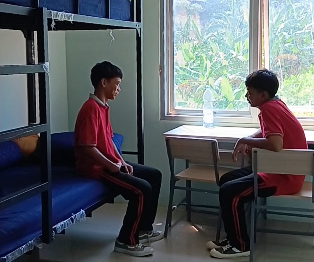 “Di sini bangun subuh, shalat, bersih-bersih, terus belajar,” tuturnya. “Makan tiga kali sehari, makannya enak—ada nasi goreng, ayam, telur, ikan,” tambahnya sambil tersenyum malu.