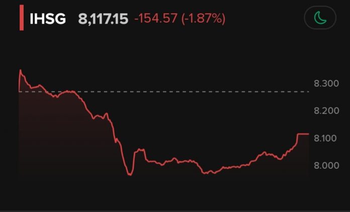SAMARINDA – Indeks Harga Saham Gabungan (IHSG) terpuruk pada perdagangan hari ini, Senin (27/10/2025), setelah anjlok 154,57 poin atau 1,87 persen ke level 8.117,15. Tekanan jual terjadi sejak awal sesi dan terus berlanjut hingga penutupan, bahkan sempat menyeret IHSG ke level terendah harian di 7.959,17 sebelum sedikit pulih.