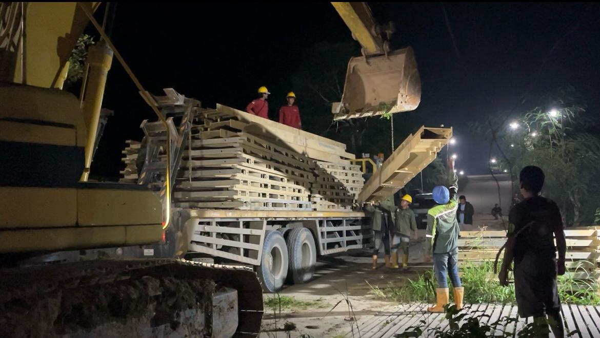 Rangka jembatan Bailey tiba di lokasi RT 24 sekitar pukul 19.30 Wita. Selanjutnya, sekitar pukul 21.20 Wita, rangka jembatan diturunkan dari truk tronton menggunakan alat berat ekskavator dengan bantuan tali pengikat.