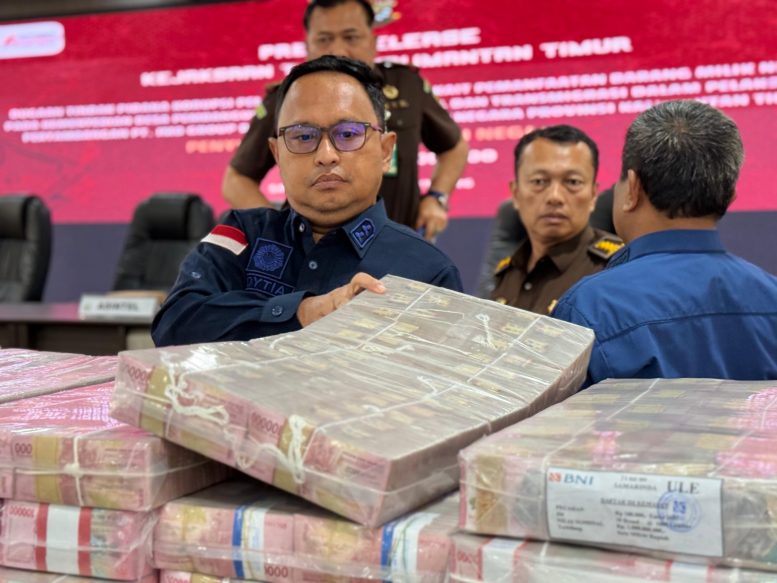 SAMARINDA – Pemandangan mencolok terlihat di Kantor Kejaksaan Tinggi Kalimantan Timur (Kejati Kaltim), Kamis (26/3/2026). Ratusan ikat uang tunai ditata rapi di atas meja konferensi pers, menjadi bukti nyata pengungkapan kasus dugaan korupsi yang berkaitan dengan operasional pertambangan PT Jembayan Muarabara Group di Kabupaten Kutai Kartanegara.