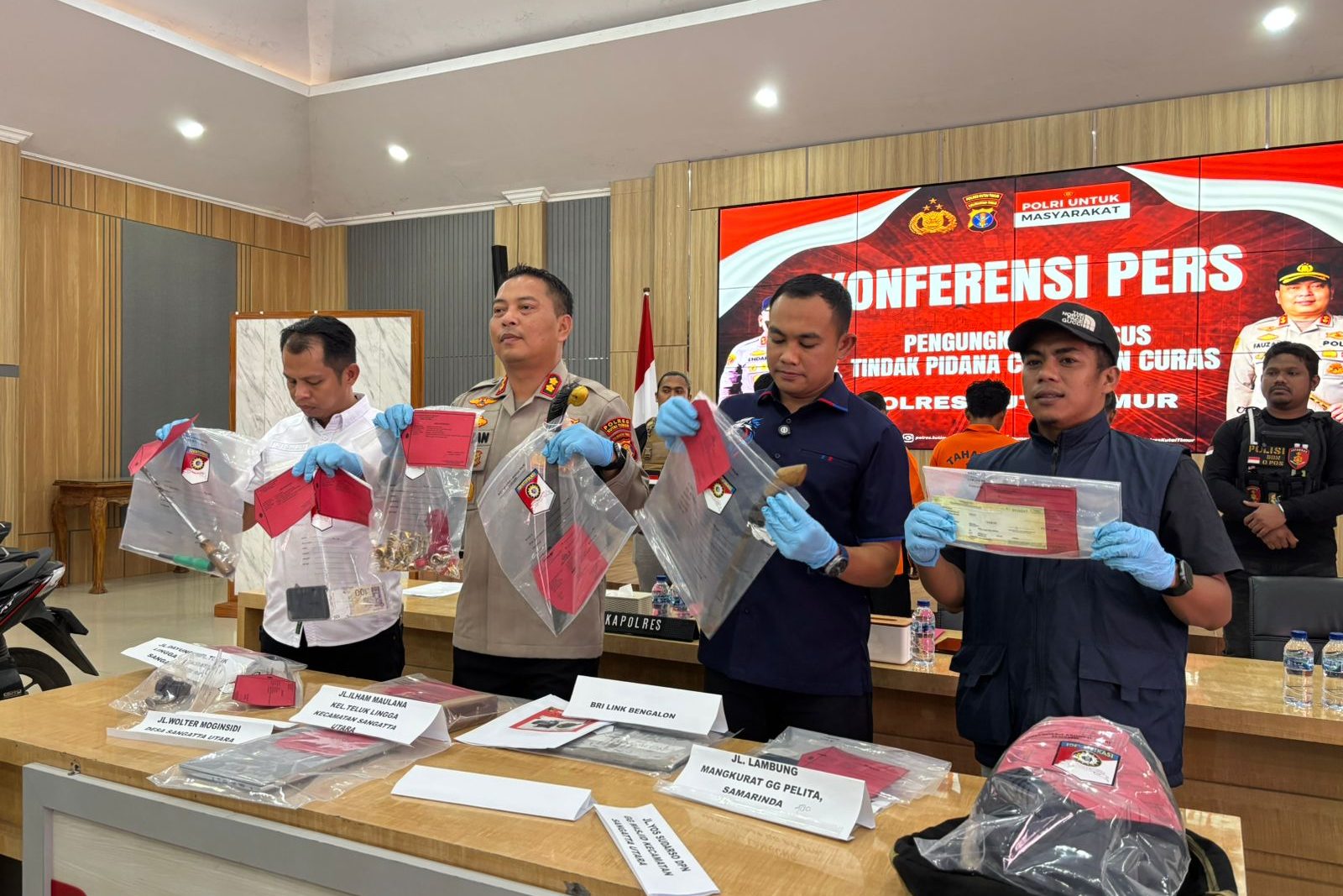 Kapores Kutim, AKBP Fauzan Arianto didampingi Kasat Reskrim Polres Kutim, AKP Ardian Rahayu Priatna menjelaskan, para pelaku menjalankan aksinya dengan membagi peran. Ada yang mengancam korban dengan senjata tajam, ada yang mengawasi situasi sekitar, dan ada pula yang mengambil uang maupun barang berharga dari dalam konter.
