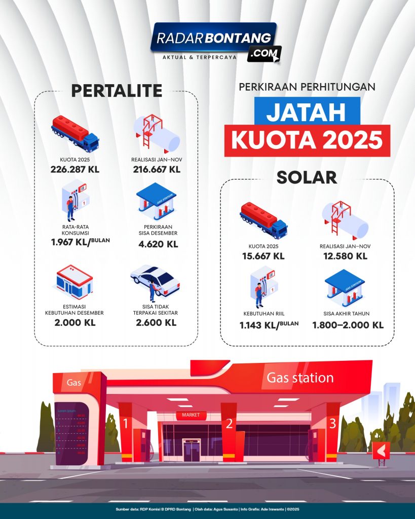 Hal serupa terjadi pada Solar. Dari kuota 15.667 kl, hingga November baru terealisasi 12.580 kl. Dengan kebutuhan riil 1.143 kl per bulan, diperkirakan ada sisa 1.800–2.000 kl di akhir tahun.