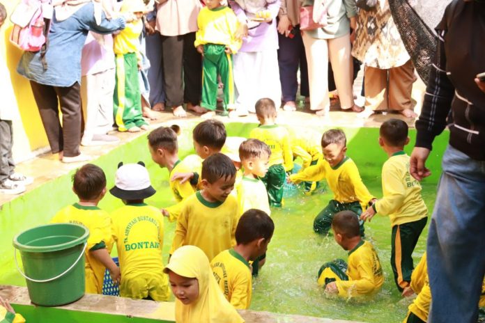 “Iya untuk siswa KB-nya kami arahkan langsung ke kolam belakang, untuk kegiatan menangkap ikan. Kalau siswa TK-nya kegiatan outbond. Tapi sebelumnya, mereka semua senam terlebih dahulu. Ini kegiatan bukan yang pertama kalinya, sekolah kami menerima kedatangan anak TK,” jelasnya.