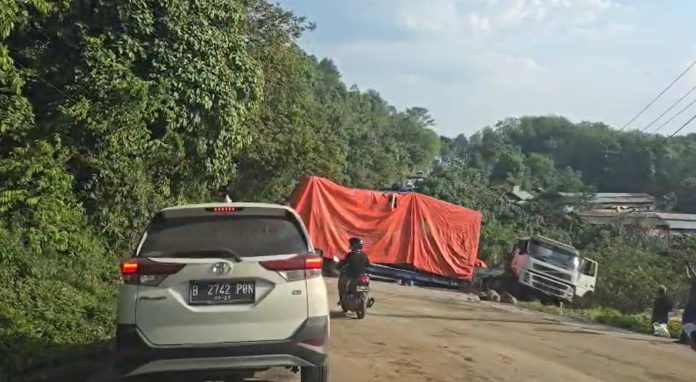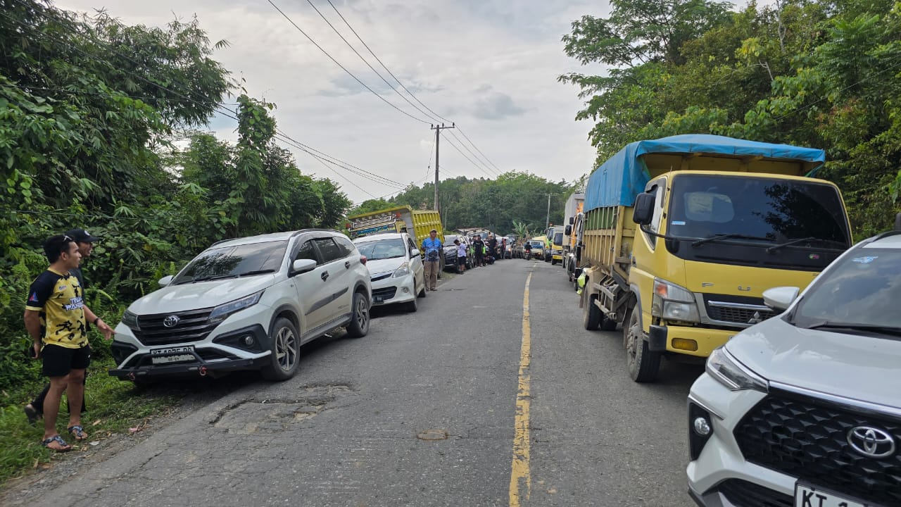 Sejak pukul empat dini hari, sebuah trailer bermuatan mesin berat tergelincir dan melintang menutup badan jalan. Kendaraan kecil sempat bisa melintas perlahan di sisi jalan, tetapi situasi berubah ketika truk lain mencoba memaksakan diri melewati jalur sempit yang tersisa.