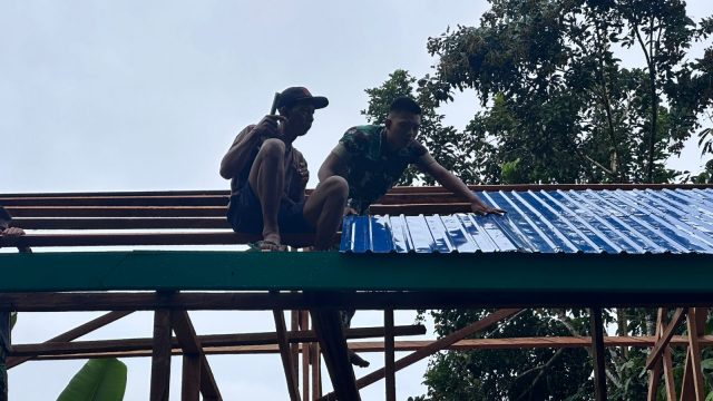 Tahap pemasangan atap menjadi penanda bahwa struktur utama bangunan telah berdiri kokoh dan kini memasuki fase penyempurnaan. Serda Yosef Geriyansen bersama warga terlihat bahu-membahu mengangkat dan memasang lembaran seng secara hati-hati agar terpasang kuat serta tahan terhadap cuaca.