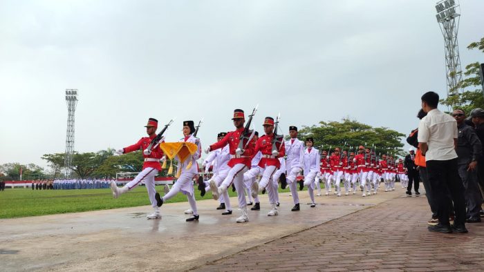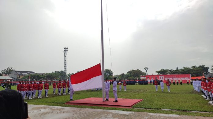 BONTANG – Bendera merah putih berhasil dibentangkan, Minggu (17/8/2025) di Lapangan Bessai Berinta Lang-lang di tengah hujan yang mengguyur lapangan selama upacara berlangsung.