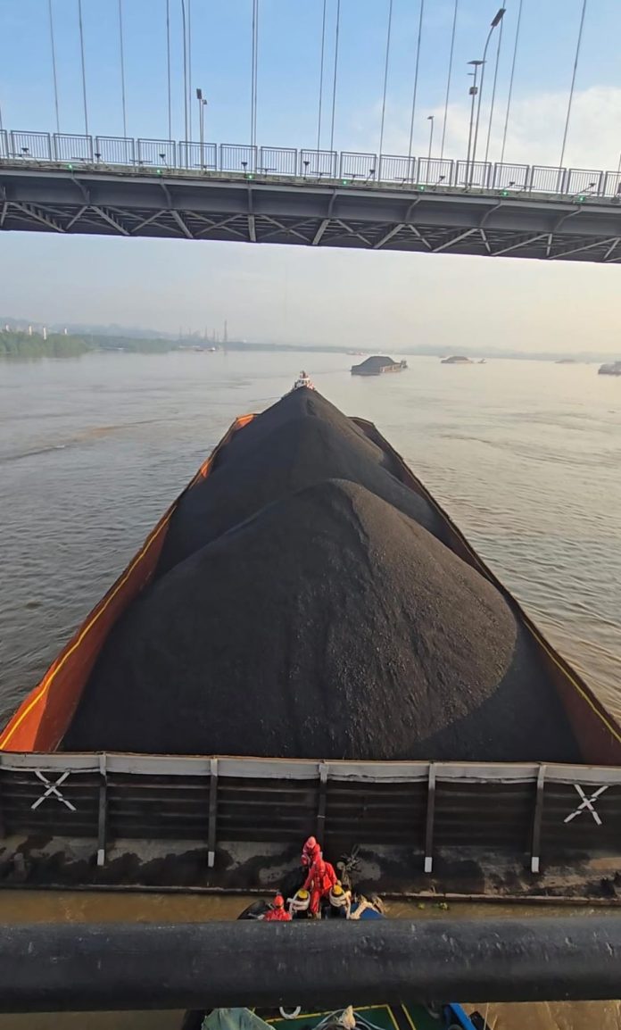 Baru beberapa menit berjalan menyeberangi jembatan, saya merasakan getaran di lantai baja ketika sebuah ponton bermuatan batu bara lewat persis di bawah. Dari jarak itu, terlihat jelas bagaimana arus sungai mendorong kapal besar mendekati pilar jembatan. Getarannya cukup kuat sampai saya sempat khawatir. Beberapa menit kemudian, getaran serupa kembali terasa ketika ponton berikutnya melintas. Pagi tadi pergerakan ponton di Sungai Mahakam cukup padat, bergiliran melintas satu per satu.