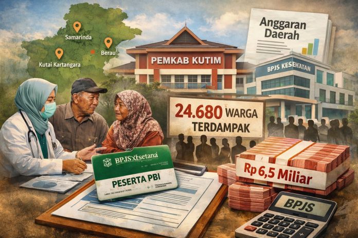 SANGATTA — Sebanyak 24.680 warga di Kabupaten Kutai Timur (Kutim) terdampak pengalihan pembiayaan peserta Penerima Bantuan Iuran (PBI) BPJS Kesehatan dari Pemerintah Provinsi Kalimantan Timur (Kaltim) ke pemerintah kabupaten. Kondisi ini membuat daerah harus bergerak cepat menyiapkan anggaran demi menjamin keberlanjutan layanan kesehatan masyarakat.
