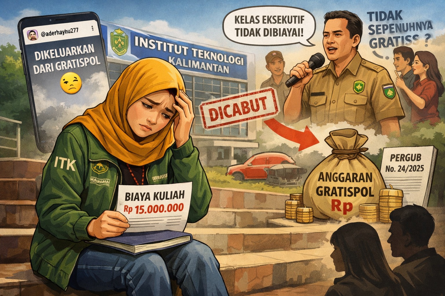 SAMARINDA — Program Gratispol Pemerintah Provinsi Kalimantan Timur kembali menuai kritik. Kali ini, sorotan datang setelah seorang mahasiswi Institut Teknologi Kalimantan mengungkapkan kekecewaannya di media sosial usai dikeluarkan dari daftar penerima manfaat program tersebut. Akun Instagram aderahayu277 menyebut dirinya kini harus menanggung biaya kuliah sebesar Rp15 juta secara mandiri.