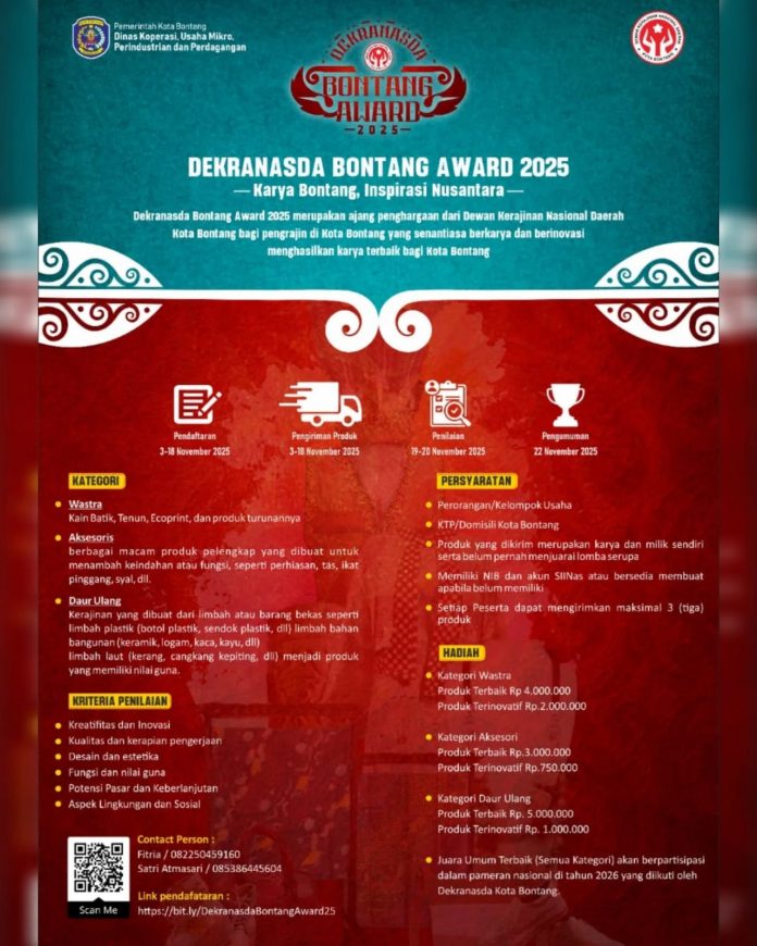 Mengutip dari laman facebook DKUMPP Bontang, pendaftaran dan pengiriman produk sejak tanggal 3-18 November 2025. Bagi yang berminat bisa mendaftar di link pendaftaran bit.ly/DekranasdaBontangAward25. Untuk Informasi dan pengiriman produk dapat menghubungi Fitria 082250459160 / Satri 085386445604.