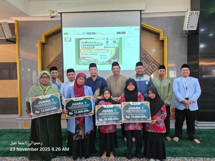 Penyerahan bonus secara simbolis itu dibagikan bersamaan dengan kegiatan pelatihan para guru ngaji BKPRMI, Minggu (23/11/2025) kemarin.