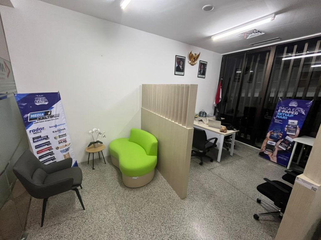 Suasana ruang kerja kami sederhana namun fungsional. Meja utama menghadap jendela besar dari lantai hingga langit-langit, membuat ruangan terasa terang. Di dinding terpasang foto Presiden dan Wakil Presiden, lengkap dengan lambang Garuda. Bendera Merah Putih berdiri di sudut ruangan. Dua banner Media Kaltim juga menghiasi ruangan: satu berisi daftar jaringan media, satu lagi kampanye pembaca e-paper setiap hari.