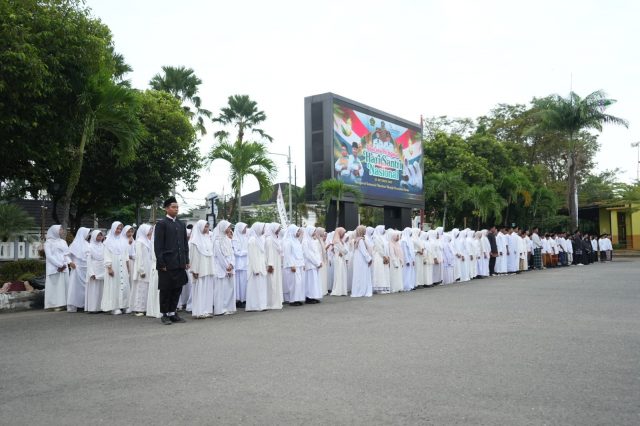Upacara diikuti oleh barisan santri dari berbagai sekolah dan pesantren di Kota Bontang, dengan petugas upacara dari MAN Bontang.