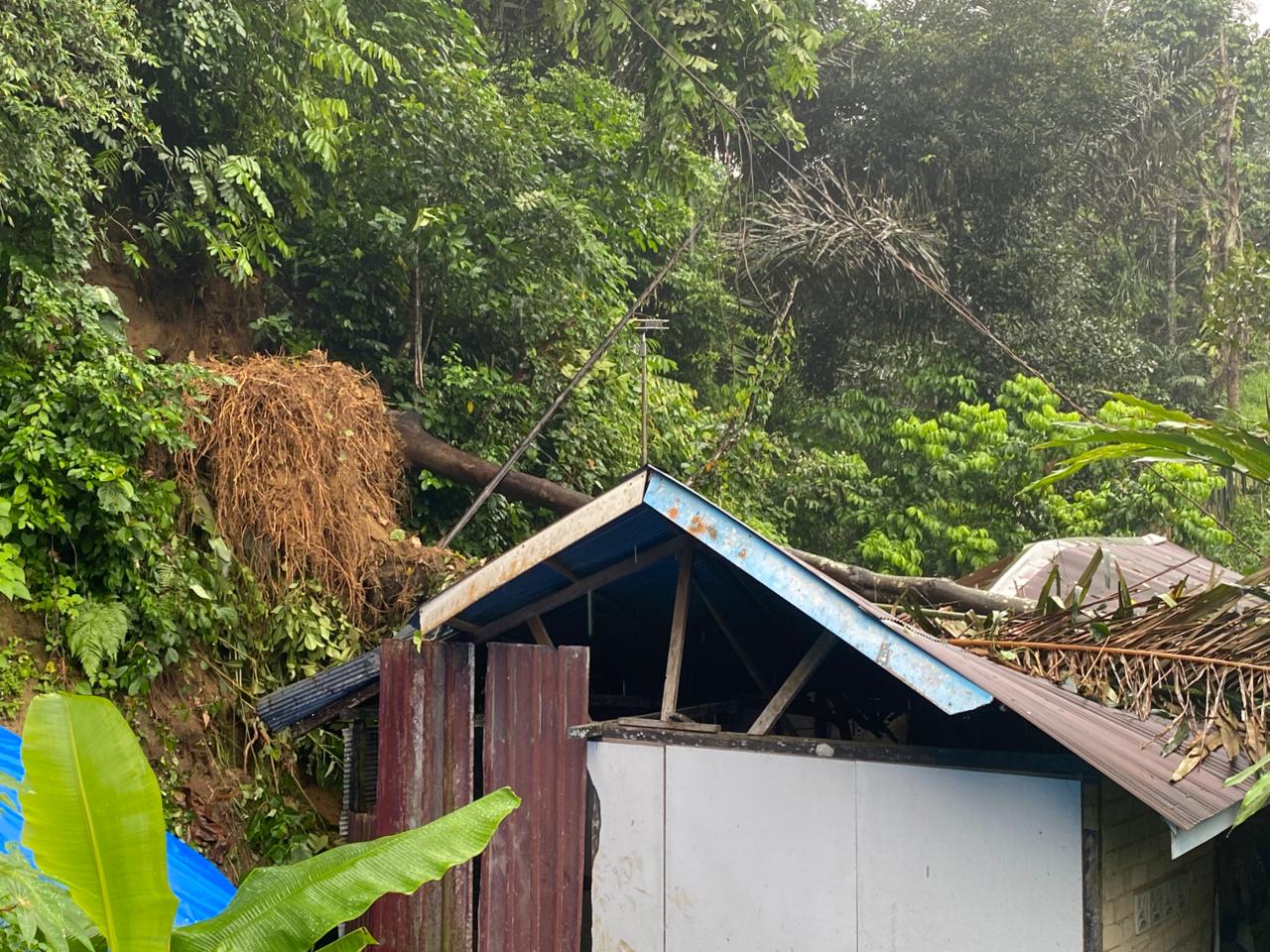 Pohon tumbang diduga dipicu kondisi tanah perbukitan yang labil serta curah hujan tinggi. “Batang pohon yang posisinya di atas bukit tergelincir dan mengenai rumah,” tambahnya.