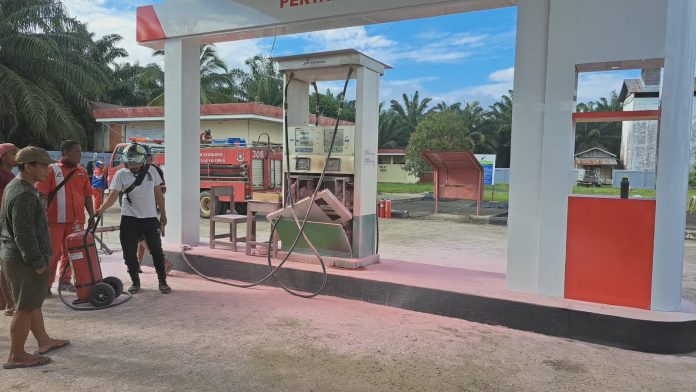 SANGATTA—Insiden ledakan disertai kebakaran kecil terjadi di Stasiun Pengisian Bahan Bakar Umum (SPBU) di Jalan Poros Muara Wahau–Bengalon, Desa Karya Bhakti, Kecamatan Muara Wahau, Rabu (15/4/2026). Peristiwa tersebut menyebabkan kerusakan pada mesin dispenser dan menimbulkan kerugian material yang diperkirakan mencapai Rp500 juta.