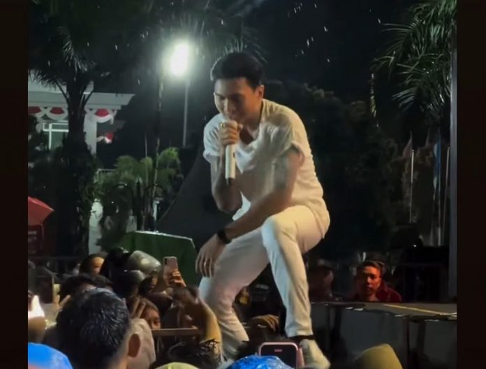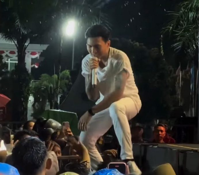 SANGATTA – Walaupun Sangatta diguyur hujan deras, namun bintang tamu di Pekan Raya Expo 2025, Anji, menunjukkan profesionalitasnya. Lantaran tetap memilih tampil memukau di bawah guyuran hujan, Kamis (23/10/2025) malam.