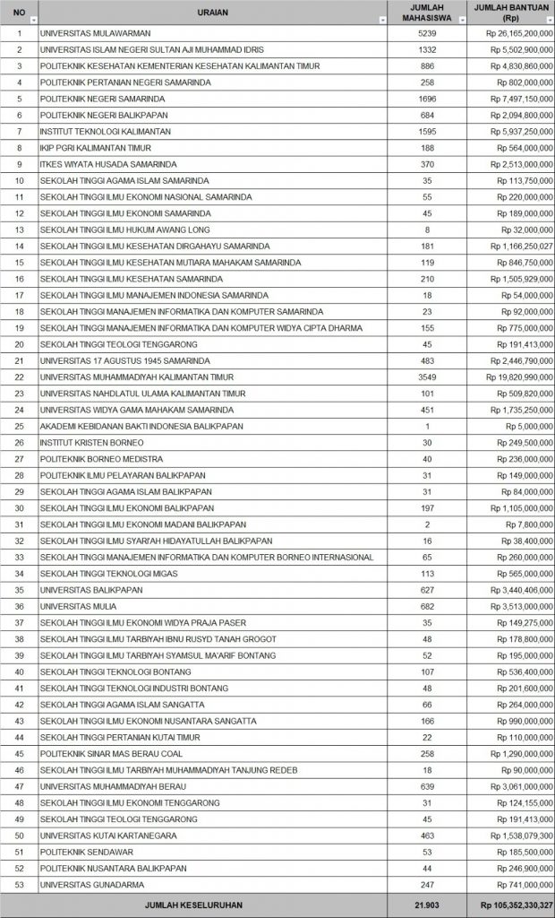 Bantuan pendidikan akan diberikan kepada mahasiswa semester satu hingga semester delapan, baik yang kuliah di perguruan tinggi wilayah Kaltim maupun melalui skema kerja sama dengan perguruan tinggi di luar daerah. Total penerima diperkirakan mencapai sekitar 124 ribu mahasiswa, mencakup jenjang S1, S2, hingga S3.