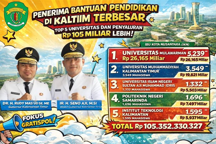 SAMARINDA — Program Gratispol milik Pemerintah Provinsi Kalimantan Timur resmi berjalan. Pada tahun akademik 2025–2026, sebanyak 21.903 mahasiswa baru di Kalimantan Timur mendapatkan pembebasan Uang Kuliah Tunggal (UKT) untuk semester pertama.