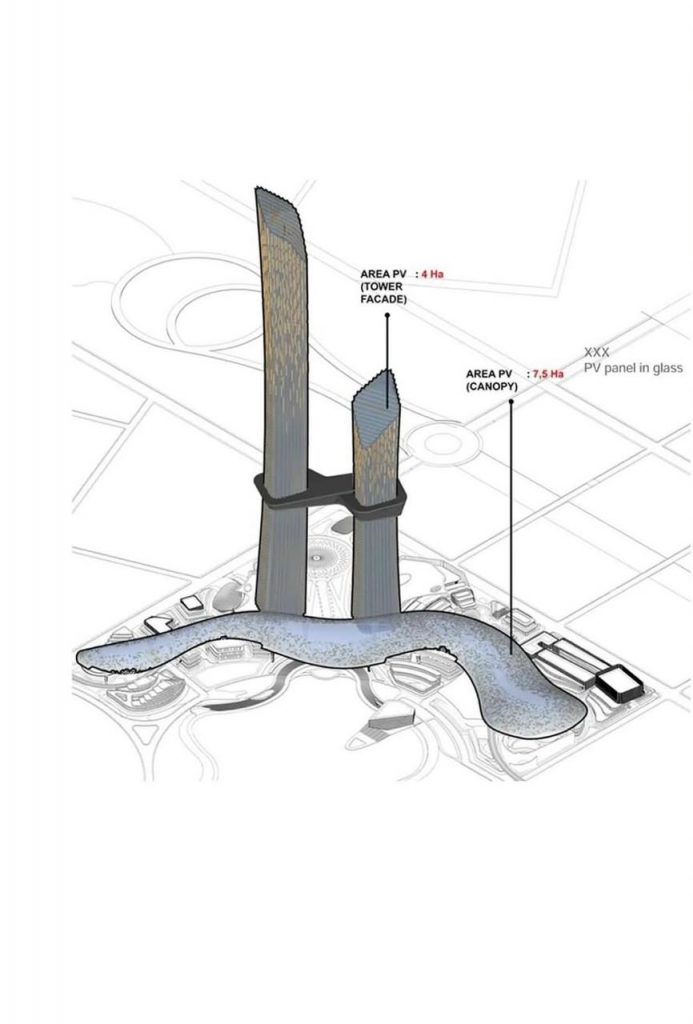 * Pemanfaatan energi terbarukan melalui solar farm dan turbin angin untuk memenuhi hingga 75 persen kebutuhan energi gedung