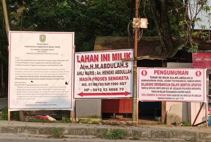 SANGATTA – Penanganan sengketa lahan di kawasan Puskesmas Sangatta Utara kian memantik tanda tanya. Setelah plang pengosongan sempat dipasang di sejumlah titik, rencana penertiban justru mendadak dibatalkan. Langkah lanjutan berupa pemberian surat teguran kepada pemilik lapak pun dipending, Senin (30/3/2026).