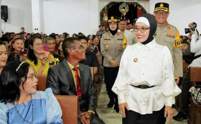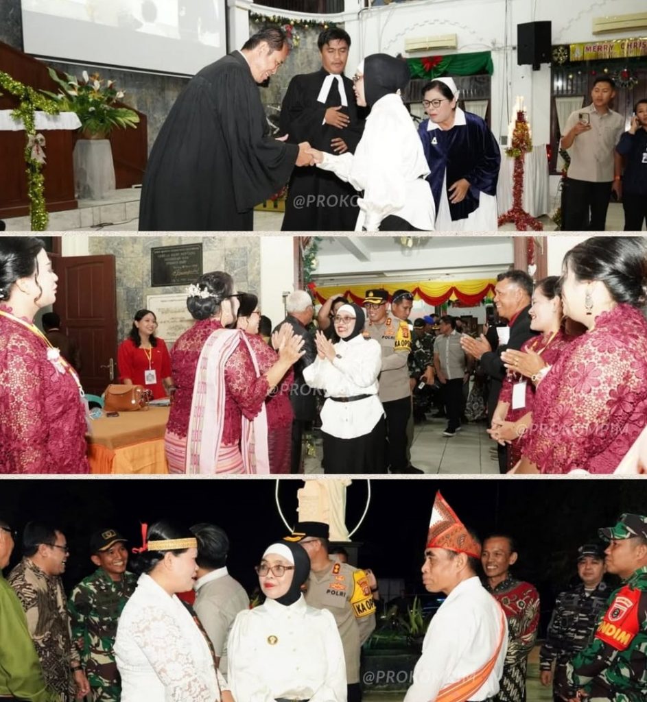 Rombongan mengunjungi Gereja Paroki Santo Yosep dan Gereja HKBP di Jalan Bhayangkara. Kehadiran Wali Kota dan Forkopimda disambut hangat oleh pengurus gereja dan jemaat yang tengah mengikuti rangkaian ibadah malam Natal.