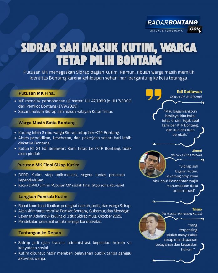 PUTUSAN Mahkamah Konstitusi (MK) pada 17 September 2025 menutup perdebatan panjang soal status Sidrap. Permohonan uji materi Undang-Undang Nomor 47 Tahun 1999 juncto UU Nomor 7 Tahun 2000 yang diajukan Pemkot Bontang resmi ditolak seluruhnya. Dengan demikian, secara hukum Sidrap sah masuk dalam wilayah Kabupaten Kutai Timur (Kutim).