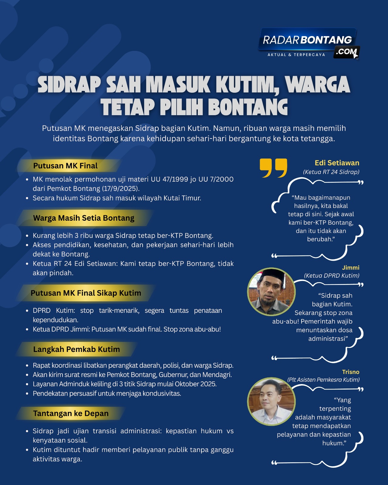 Di sisi lain, DPRD Kutim menegaskan tidak boleh ada lagi tarik-menarik administratif yang berlarut-larut. Ketua DPRD Kutim, Jimmi, meminta pemerintah daerah segera menuntaskan penataan kependudukan. “Putusan MK sudah final dan mengikat. Artinya Sidrap sah bagian Kutim. Sekarang stop zona abu-abu! Pemerintah wajib menuntaskan ‘dosa’ administrasi yang selama ini membebani warga,” tegasnya.
