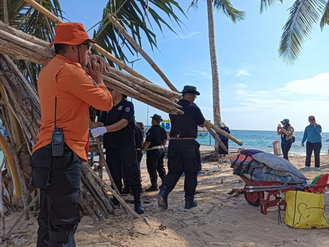 Saat sampai di lokasi, petugas langsung membongkar bangunan penyimpanan alat snorkeling, gazebo kecil, serta menertibkan sejumlah material seperti tandon air yang tidak sesuai penempatannya.