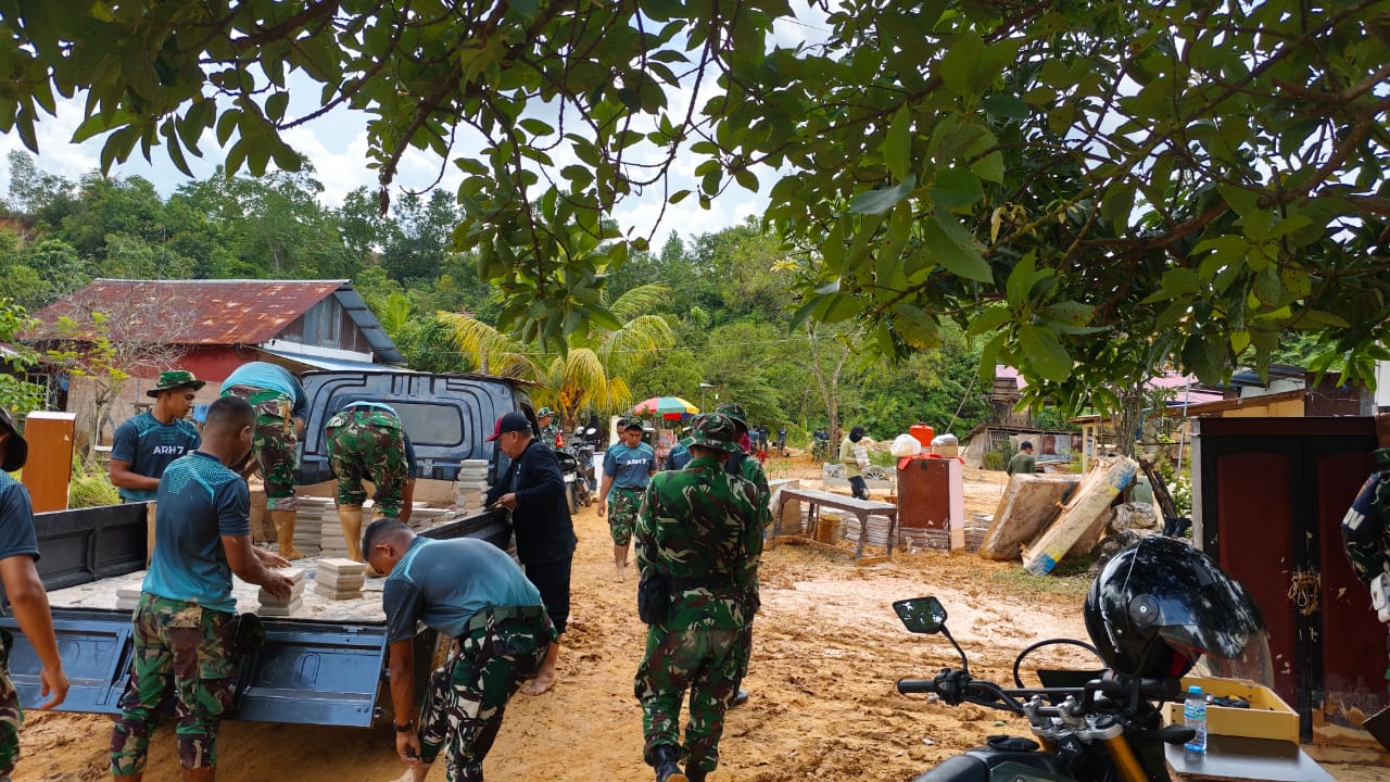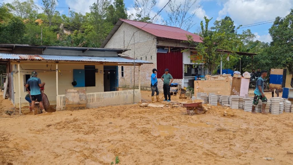 BONTANG – Dampak banjir disertai material pasir dan tanah longsor di RT 1 Kelurahan Kanaan, Kamis (15/1/2026) lalu, mulai dilakukan pembersihan oleh anggota Arhanud 7/ABC Bontang, yang mengerahkan personel membantu warga terdampak, Senin (19/1/2026).