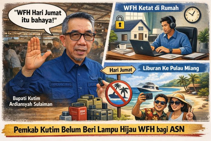 “Saya melihat kalau hari Jumat itu disuruh WFH, bagi orang Kutai Timur itu bahaya. Nanti bukan di rumah, tapi ada di Pulau Miang atau sebagainya. Nah, itu bahayanya,” ujarnya kepada awak media, Kamis (9/4/2026).