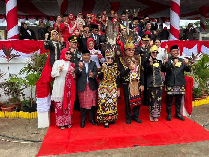 BONTANG – Wali Kota Bontang, Neni Moerniaeni mengenakan pakaian adat Dayak khas Kalimantan Timur, di upacara peringatan Hari Ulang Tahun (HUT) Republik Indonesia (RI) ke-80, yang berlokasi di Stadion Bessai Berinta (Lang-Lang), Minggu (17/8/2025).