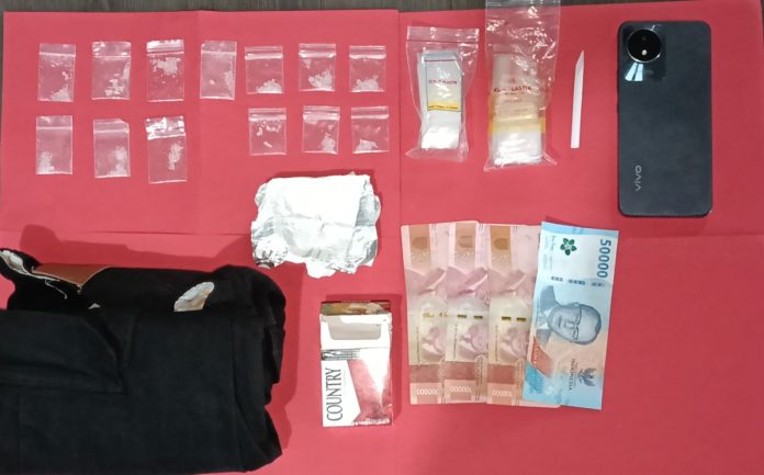 “Adapun barang bukti yang berhasil kami amankan berupa satu aluminium foil, dua bungkus plastik klip, satu sedotan berujung runcing, satu celana kain, satu kotak rokok merek Country, uang tunai sebesar Rp 350 ribu, serta satu unit handphone merek Vivo,” jelasnya.