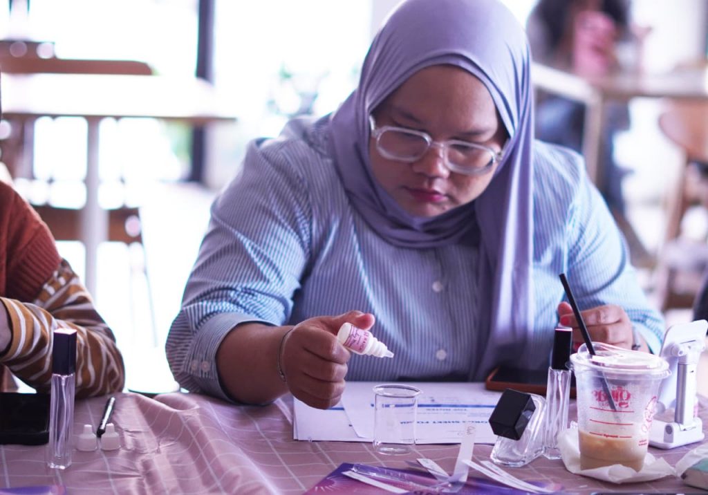 Peserta tampak aktif memilih bibit parfum sebagai bahan dasar kreasi mereka. Beragam pertanyaan muncul, mulai dari karakter aroma, teknik blending, hingga peluang memulai usaha parfum rumahan.